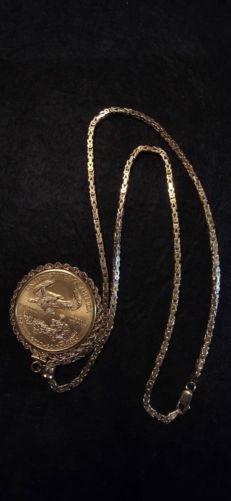 Cadena de oro 14 kilates El círculo que esta al rededor de la cadena tambien es 14 kilates Con Modena de 1 Oz fine gold 50 dollars EAGLE coin 10,300