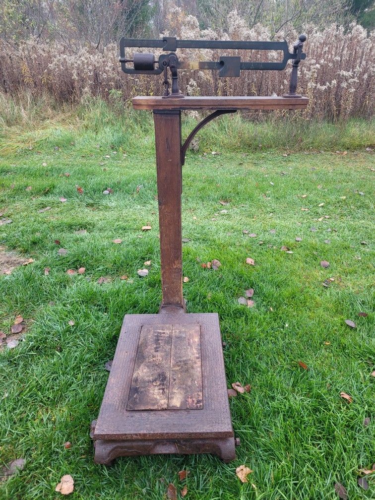 Vintage Floor Scale 1000 poundd, #F6053. Over all measures about 29" wide x 34" long x 50 1/2" tall. Scale platform measures about 17" wide x 24 1/2" long. Wheels roll good. Sliding weights, slide good, locking lever for the bar, needs recalibration. Used