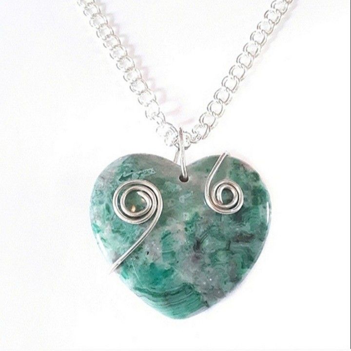 Green and gray agate heart shaped pendant on silver necklace. This green and gray agate is a unique colored heart shaped stone wrapped in silver plated copper wire. Comes on a 20" inch silver necklace. New! Green agate increases compassion, generosity and a keen sense of justice, along with enhancing mental and emotional flexibility, improving decision-making and resolving disputes. Womens ooak artisan jewelry one of a kind gifts