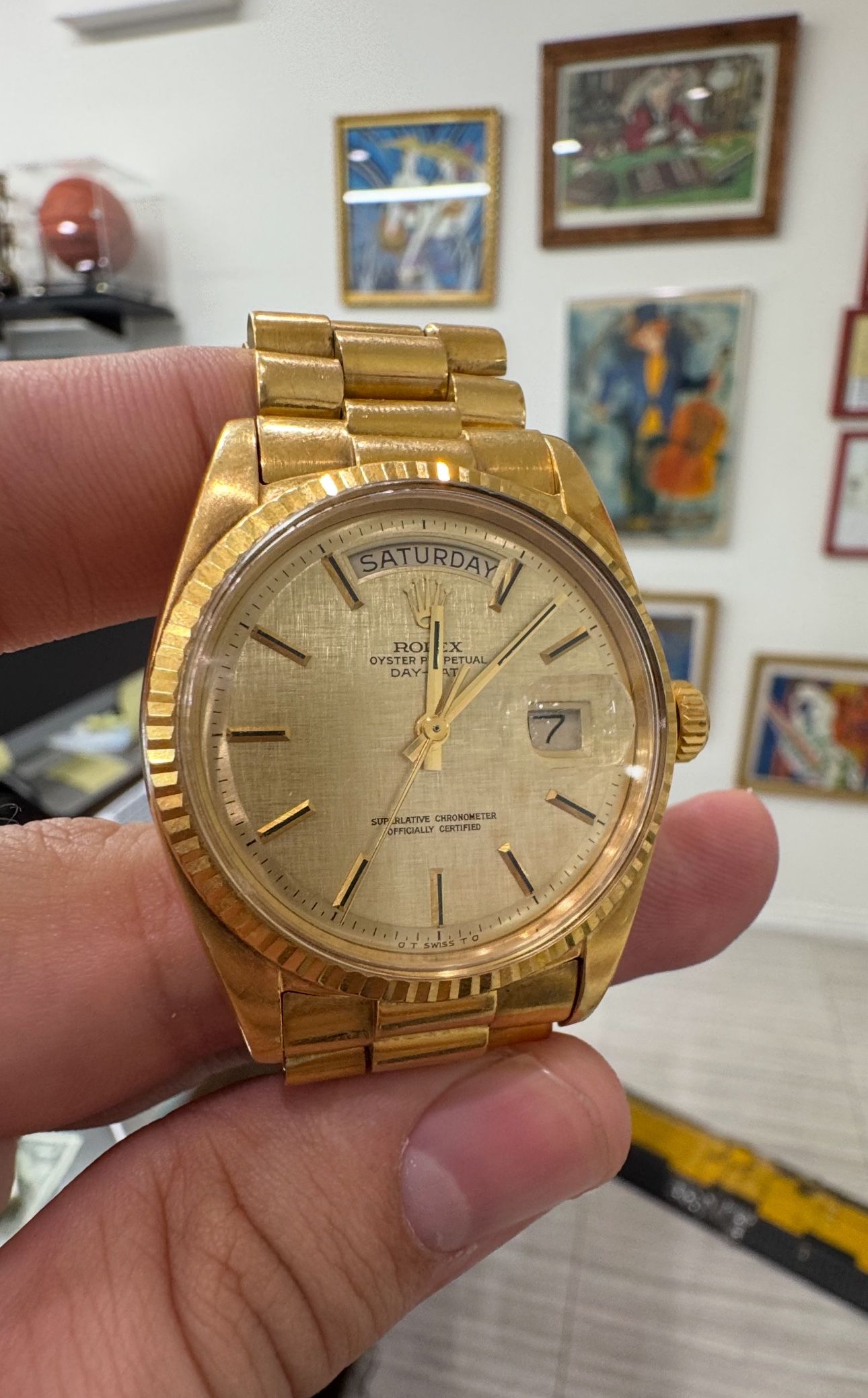 Authentic vintage Rolex Day-Date President reference 1803 in solid 18K yellow gold. This watch dates to 1973 based on the serial number and is powered by the correct Rolex Calibre 1556 automatic movement.