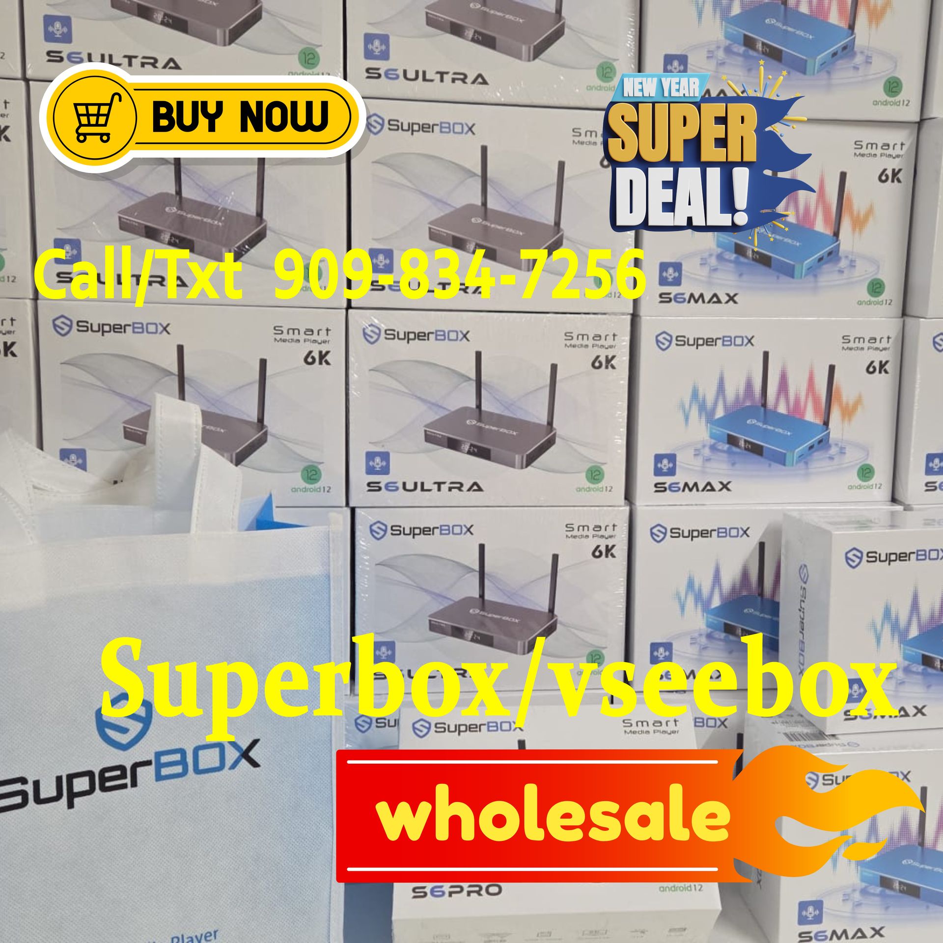 All-New Superbox S7 Max S7 Pro Superbox S6 Pro Max Ultra VSEEBOX ELITE ULTRA VSEEBOX V6 PLUS VSEEBOX V6 Max VSEEBOX V3 PLUS VSEEBOX ELITE MINI Experience next-level entertainment with our most powerful device ever. Featuring 6K resolution and the lightning-fast Cortex-A53 processor. Local pickup in Baldwin Park Ca!! Available with Lowest prices and price match guaranteed. Ask us about WHOLESALE prices. Vseebox v3 plus limited instock $230 each 2-5 box $220 each 5-10 $205 each VSEEBOX V5 PRO 1 BOX $195 2-5 BOXES $190 UNITS 6-9 BOXES $185 UNITS 10+ BOXES $175 UNITS 20 BOXES $170 UNITS More than 20 contact us for wholesale specials New Arrival 2025 Edition 💥VSEEBOX V6 PLUS ( 6 apps multi split screen ) NEW INSTOCK 🔥 1 BOX $240 2-5 contact for pricing 6-9 contact for pricing More than 20 contact us for wholesale specials New Arrival 2025 Edition 💥VSEEBOX V6 MAX NEW INSTOCK 🔥 1 BOX $200 2-4 contact for pricing 5-9 contact for pricing 10+ contact for pricing 20 contact for pricing More than 20 contact us for wholesale specials New Arrival 2025 Edition 💥VSEEBOX ELITE MINI (15 apps) - 1 unit $240 - $225 WHOLESALE PRICES 💥Vsee Elite Ultra. (21 apps) - 1 unit: $310 - Wholesale prices inquired New Arrival 2025 Edition 💥S7 PRO. 32Gb Storage - 1 unit: $170 - 2-4 units: $160 - 5-9 units: $155 - 10+ units: $150 💥S7 Max. 64Gb Storage - 1 unit: $180 - 2-5 units: $175 - 10+ units: $170 - 20+ units: $165 - 40+ units: $160 New Arrival 2025 Edition 💥S7 Ultra. 128Gb Storage - 1 unit: $190 - 2-5 units: $185 - 20 units: $180 - 40+ units: $170 💥S6 PRO. 32Gb Storage - 1 unit: $135 - 2-9 units: $130 - 10+ units: $125 - 20+ units: $120 💥S6 MAX. 64Gb Storage - 1 unit: $165 - 2-3 units: $160 - 4-9 units: $150 - 10+ units: $145 - 20+ units: $140 💥S6 ULTRA. 128Gb Storage - 1 unit: $180 - 2-3 units: $175 - 4-9 units: $170 - 10+ units: $150 - 20+ units: $145 💥SuperBox has 1 year manufacturers warranty 💥Store business hour💥 💥Location: 4219 alderson ave unit C. Baldwin Park 91706, CA 💥 Mon-Sun 10 AM - 5 PM, Call/Text Us Now (909)834-7256 Free Lifetime Updates: Powered by 4GB of RAM and 64GB of storage, this device is a multimedia powerhouse. Enjoy ultra-fast streaming with support for a 1000Mbps Ethernet connection, dual-band WiFi, and the latest WiFi 6 technology. Plus, the upgraded Bluetooth remote with voice command makes navigating your content easier than ever. Content - 6K Media Player - Android TV Box - Free Lifetime Updates - Home Entertainment - Online Content Don't miss out on the chance to transform your living room into an entertainment paradise. Take the plunge into the future of the SuperBox S7 Max Media Player today!
