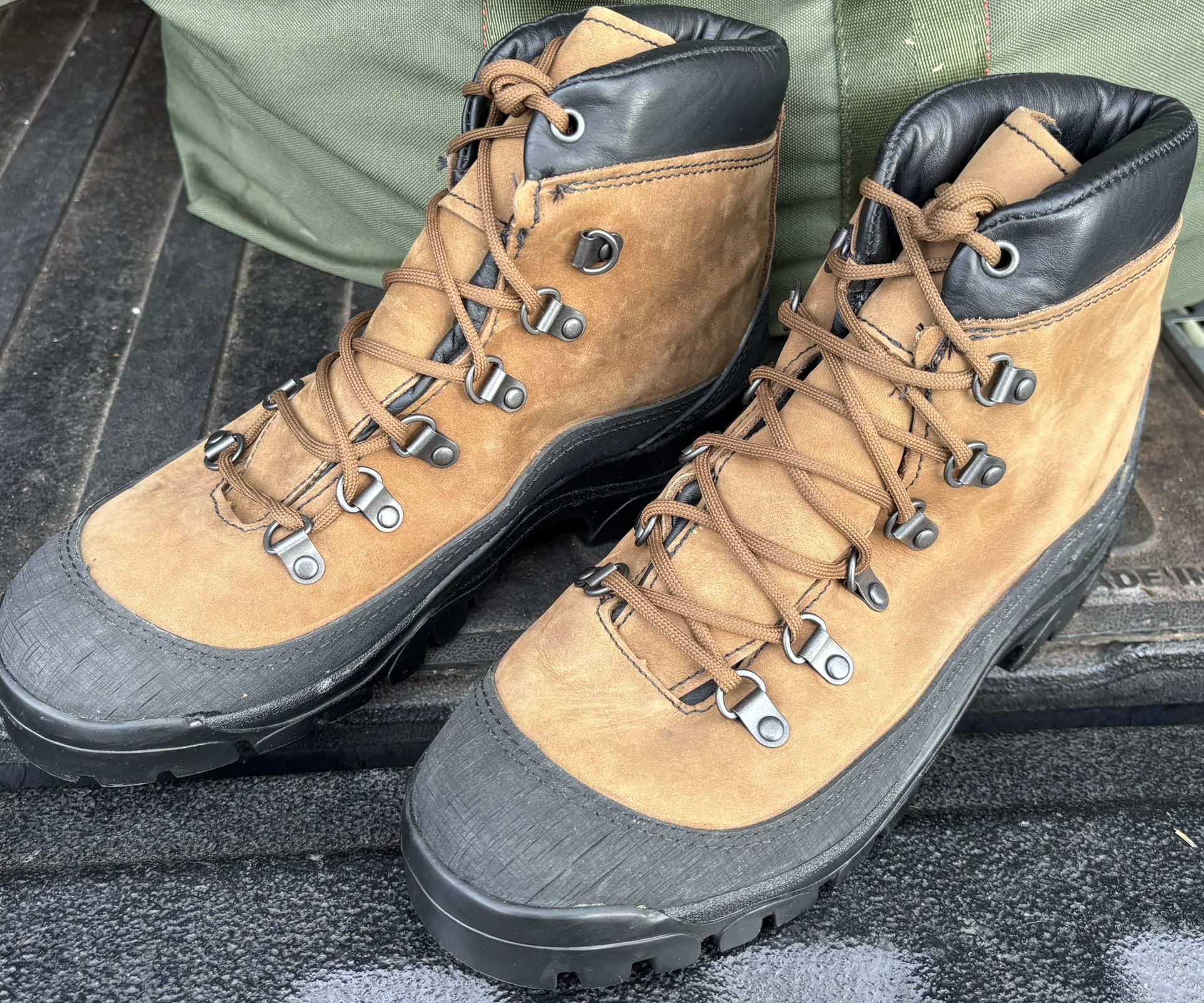 Bates Combat Hikers, military surplus, like new, men’s size 10 R. Compare retail. Brown upper with Black toe, collar, and outsole Upper: Nubuck leather with protective rubber rand and toe/heel guards Lining: GORE-TEX waterproof/breathable membrane Outsole: Vibram heavy-lug rubber (Vibram branding on soles) Closure: Lace-up with metal D-rings and speed hooks Collar/Tongue: Padded collar and gusseted tongue to keep out debris and moisture