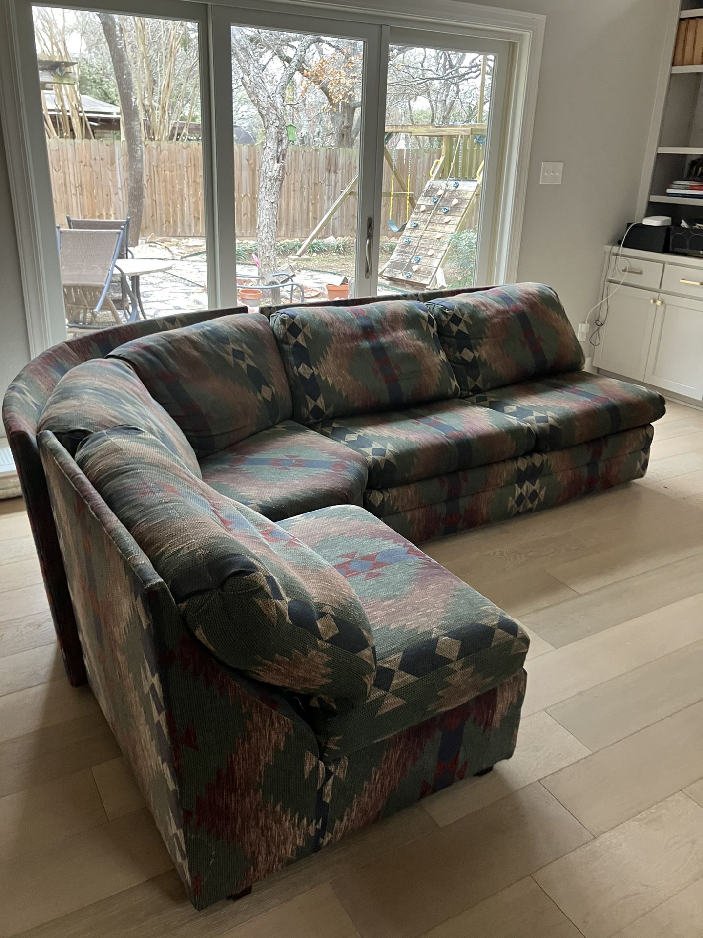 Four piece sectional sofa with fold out bed. Original owner. Moved and downsizing. There is a tear behind one of the cushions that isn’t visible unless you look for it. It can probably be sewn back together. See picture. Normal wear, good condition. FREE IF YOU PICK IT UP.