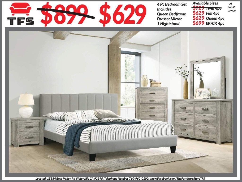 4pc Bedroom Set Full $629 4pc Includes Upholstered Fabric Bedframe (No Boxspring Required) Dresser mirror nightstand Light Grey Bedroom Set Queen $629 4pc Includes Upholstered Fabric Bedframe (No Boxspring Required) Dresser mirror nightstand Light Grey Bedroom Set Eastern king/California King $699 4pc Includes Upholstered Fabric Bedframe (No Boxspring Required) Dresser mirror nightstand Light Grey Bedroom Set VISIT US TODAY THE FURNITURE STORE 15584 BEAR VALLEY RD VICTORVILLE CA 92395 OPEN 7 DAYS A WEEK 10AM-6PM FINANCING AVAILABLE NO CREDIT NEEDED 90 DAYS OR 100 DAYS 0% INTEREST DELIVERY AVAILABLE IF NEEDED RESTRICTIONS APPLY: Prices are Subjected To Change Without Notice
