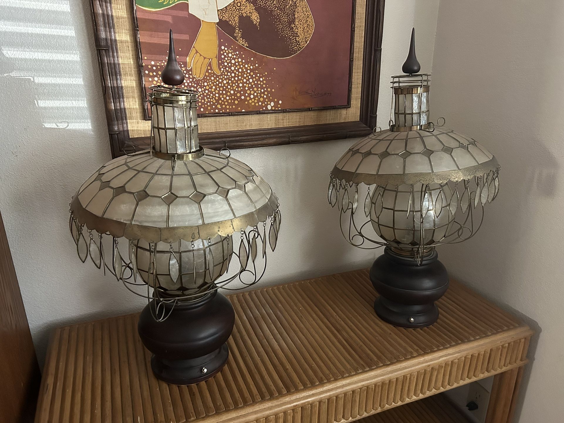 Beautiful matching pair of capiz-style table lamps featuring mother-of-pearl shell panels, brass-tone latticework, and delicate shell fringe. Both lamps are in very nice cosmetic condition with only 1 fringe on one lamp missing although this defect is subtle. One lamp works perfectly. The second lamp does not currently turn on and likely needs a simple switch or wiring repair. Because of this, the pair is priced accordingly and sold as-is. Approximate height is 24”. Asking $100 OBO for the pair.
