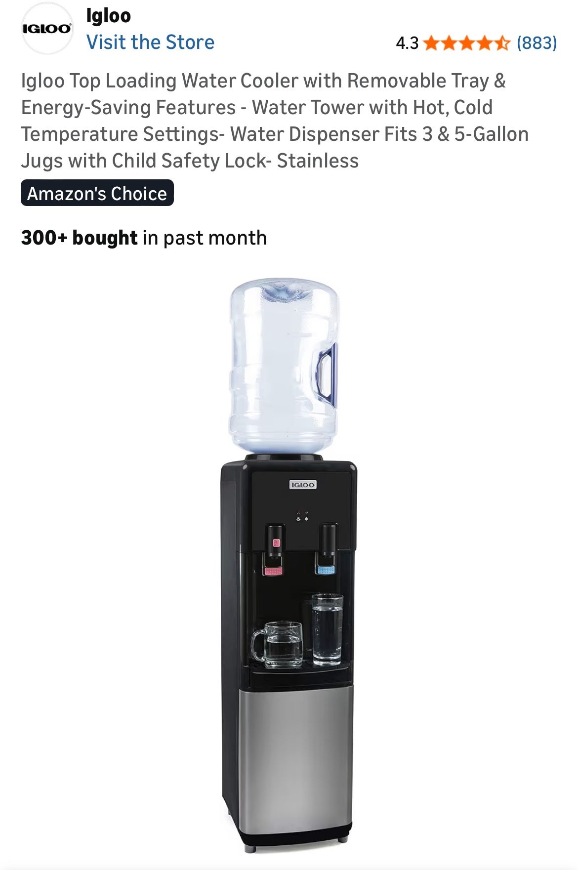 New! Igloo Top Loading Water Cooler with Removable Tray & Energy-Saving Features-hot & cold settings