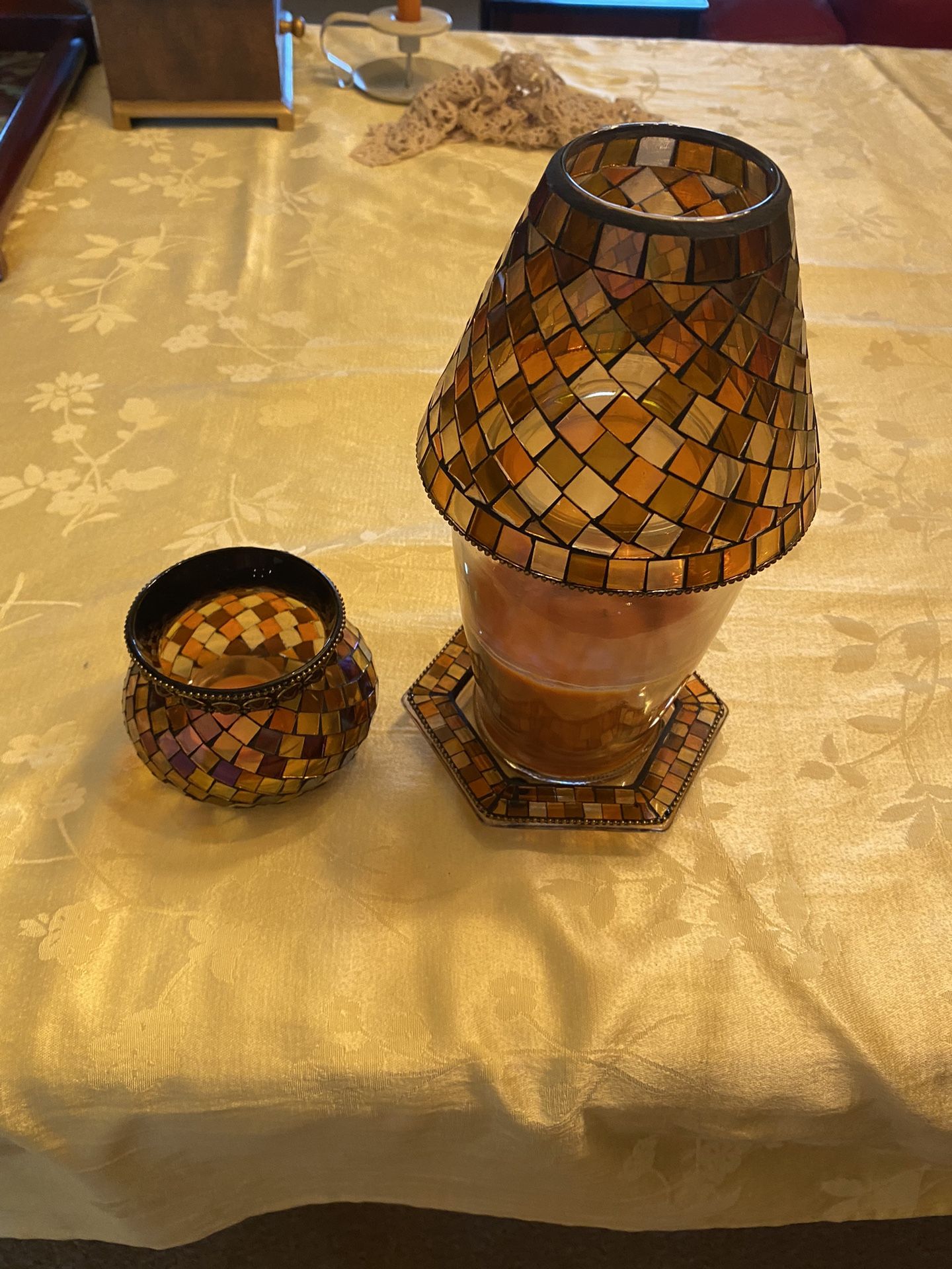 This is a very nice Party Lite mosaic set in amber colors. I have had this for years, but I’m changing the colors in my room. It has no chips or cracks. It will work with almostr any jar candle. Votive holder is about 4 inches in diameter. Jar candle is about 10 inches tall. They are very nice. I’m near 56th St. and Thunderbird. See my other offers. If I ship this, I will not send the partially used jar candle. Just the mosaic pieces.