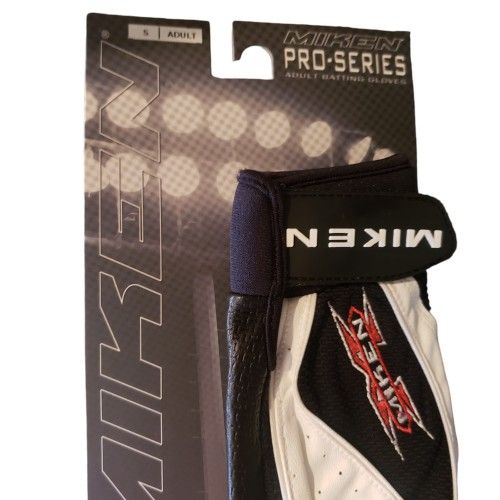 Size: Adult Small Condition: Brand New (did not use) Brand: Miken Model: Pro-Series Color: White / Black Mesh back allows hands to breathe Adjustable elastic wristband for a secure fi Seamless one piece palm for comfort and durability 1350