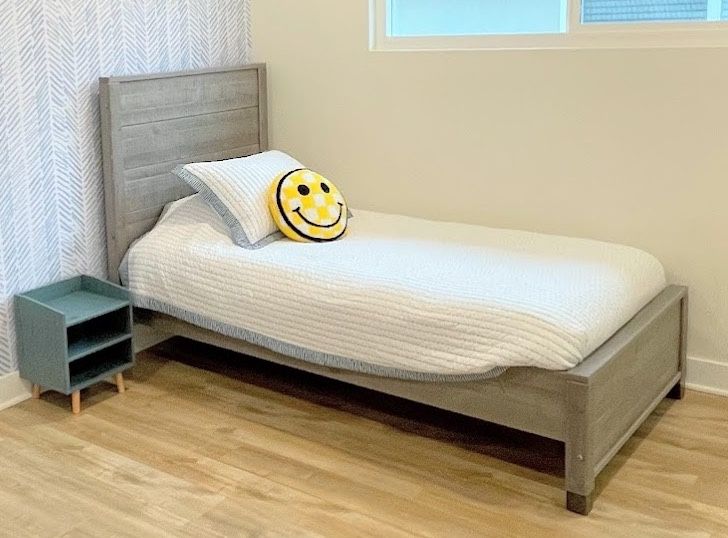 Pick-up ideally today! Gray wood frame. Twin size. Mattress, mattress cover, and sheet set included if desired.