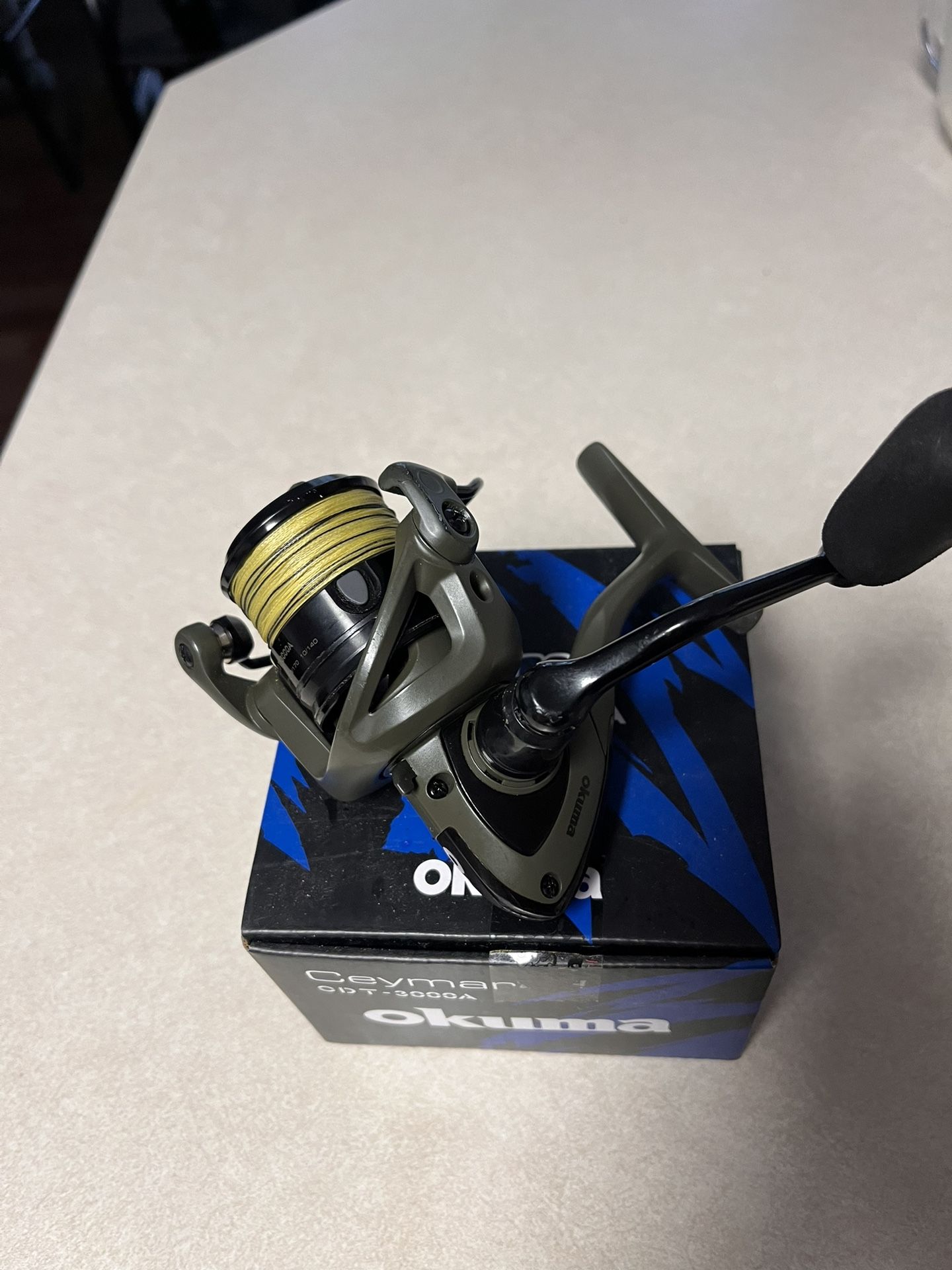 Okuma ceymar 3000 with 40 lb power pro yellow braid. Great reel maybe used like 5-10 times.