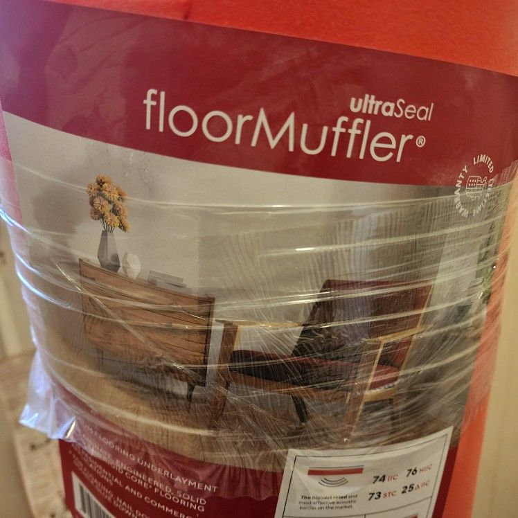 Ultra Seal Floor muffler originally 600 sq ft used small amount will have more than 400 sq ft. 48 inches x 2mm for hardwood, laminate and engineered floor. Premium underlayment .