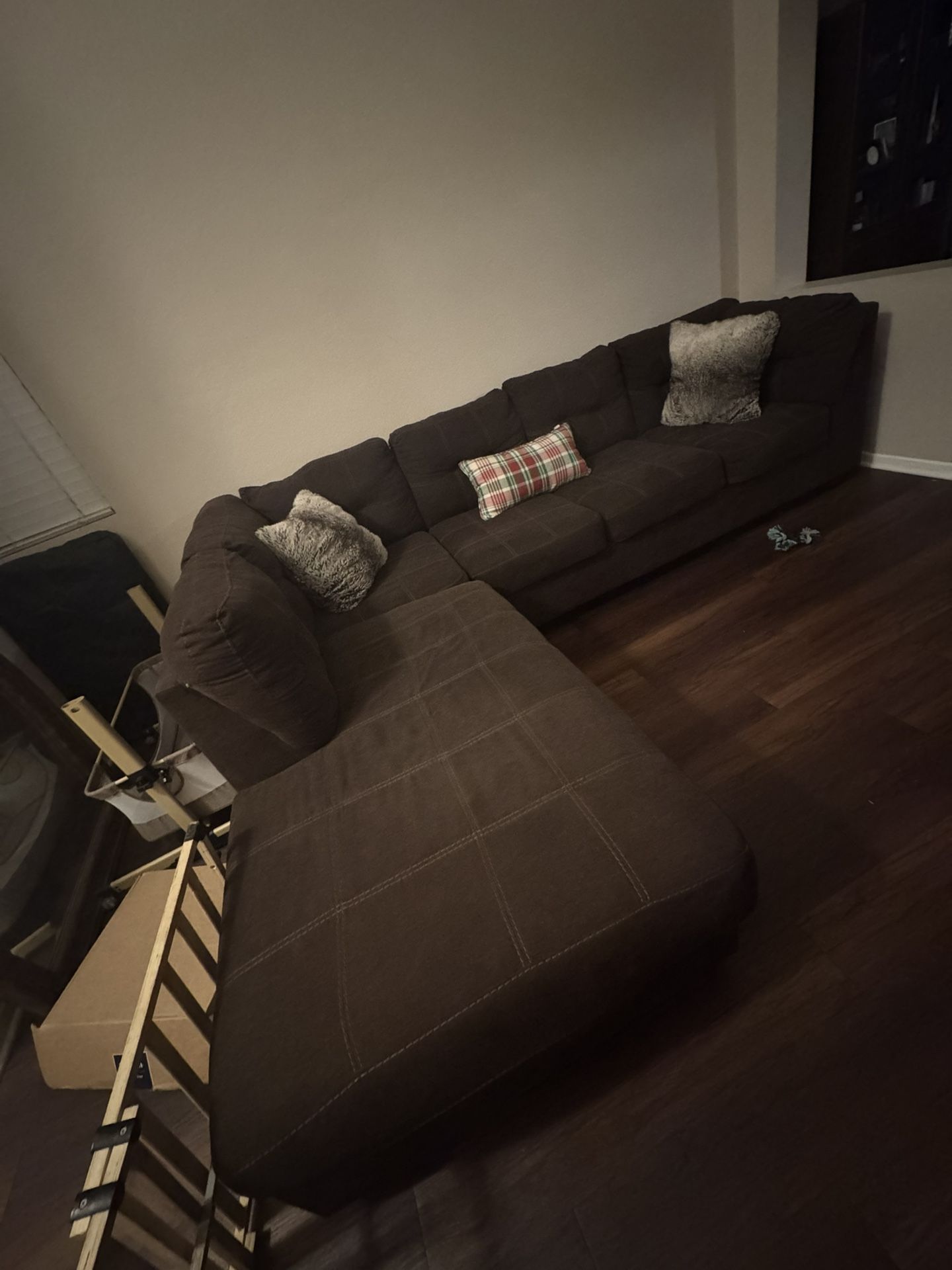 Dark brown medium sectional Couch . Good condition No rips , normal wear and tear. Serious buyers only asking for $100- OBO Pick up only in Fontana ( south ridge )