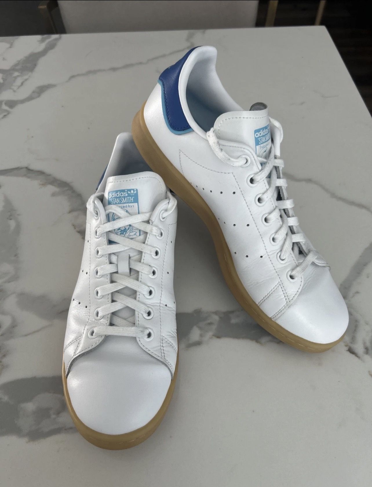 Hi- Up for sale are a pair of gently preowned men's Stan Smith Adidas in white with blue accents and a gum sole- Style #FU9600. The shoes are in really nice condition with very little wear on the uppers as well as lower gum soles (see photos). Only worn a few times and they have been stored in my closet. Box not included in sale. The product is a pair of Adidas Stan Smith sneakers in a size 9.5. Featuring a white colorway with blue gum accents, these athletic shoes are made of leather and are part of the Adidas Stan Smith product line. The style code for this model is FU9600, making it easy to identify and purchase the specific pair you are looking for. With the iconic Adidas brand and classic sneaker style, these shoes are sure to be a stylish and comfortable choice for any man looking to step up their footwear collection.
