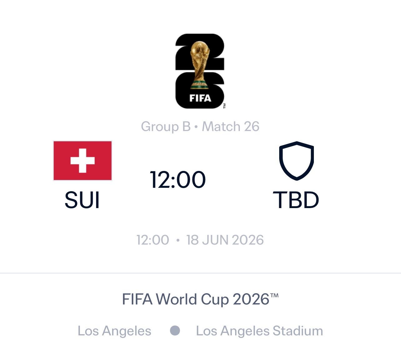 I have four tickets to the Switzerland versus Italy (hopefully) World Cup game on June 18, 2026 at SoFi Stadium in Los Angeles. Please message me how much you would offer for the game. I would prefer to meet in person anywhere in Southern California and I can transfer the tickets to your FIFA account and I can take the cash. Please let me know if you have any questions.