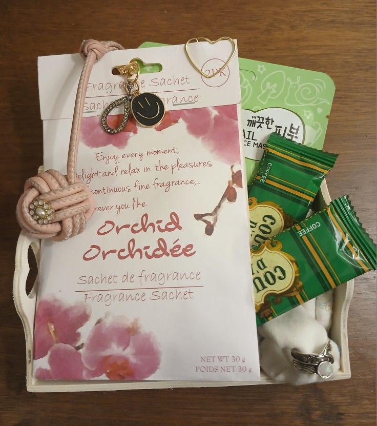 Elegant handmade pink jeweled purse tassel or Keychain and accessories gift set. Includes a face mask, set of 2 fragrance bags with an adorable gold toned heart-shaped clip holding them together, 2 sealed delicious Korean cookies and a silver and opal size 7 ring(other ring sizes are available). The wood tray has heart cut handles and can be customized in any way you'd like or left with the natural wood. I've included an example of a recent custom order design, but the tray can be engraved, painted, add scroll work and adorned in any way you'd like. Message me with any ideas, text or color you'd like added to the tray. This is also avaliable to be done in a wooden box with a metal clasp closer as well. Depending on any custom work done to the tray the price will be adjusted accordingly and agreed upon before making any changes. Gift sets are available in wooden boxes with a metal clasp or baskets and can have different themes as well. Men's gift baskets are available as well.