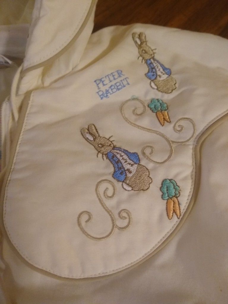 Peter Rabbit baby bunting. Can buckle in car seat. In new condition. Keeps baby warm in car seat and or stroller.