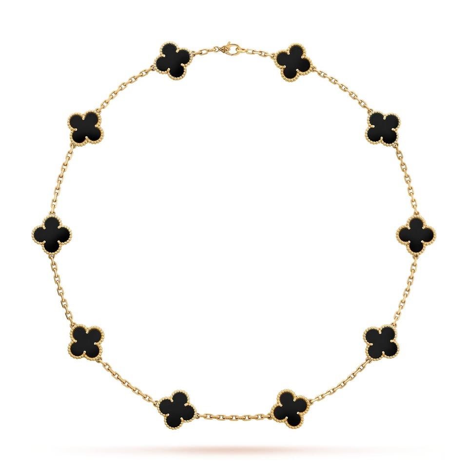 18K Gold Van Cleef & Arpels Vintage Alhambra 10 Motifs Necklace VCARA42700 Lot includes necklace & small bag (as pictured). Necklace length is 16.54". I also have Van Cleef earrings, necklaces, rings & bracelets available for sale! Check my selling page! REFERENCE VCARA42700 STONE Onyx: 10 stones As each stone is unique, its color and features may vary from one creation to another CLASP Hallmark clasp, small model in 18K yellow gold SIZE Chain length: 16.54 inches