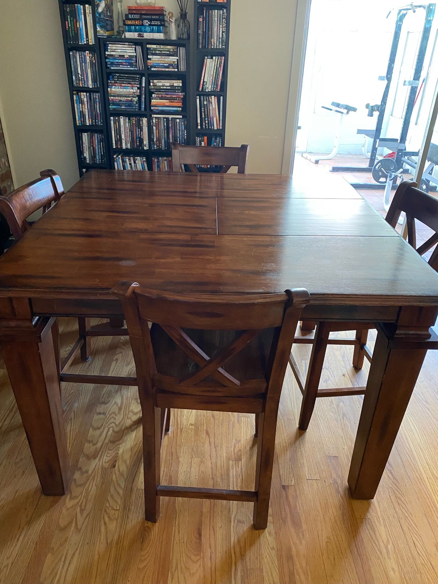 Dining room table with 4 chairs. Real wood. The table becomes large square when the extension as shown is in place. That extension has the ability to collapse and be stored under the table and in turn makes the large table into a smaller rectangular table. The table is very heavy and sturdy and was bought from a high end furniture store in San Diego. Moving have to sell ASAP. 400 obo.