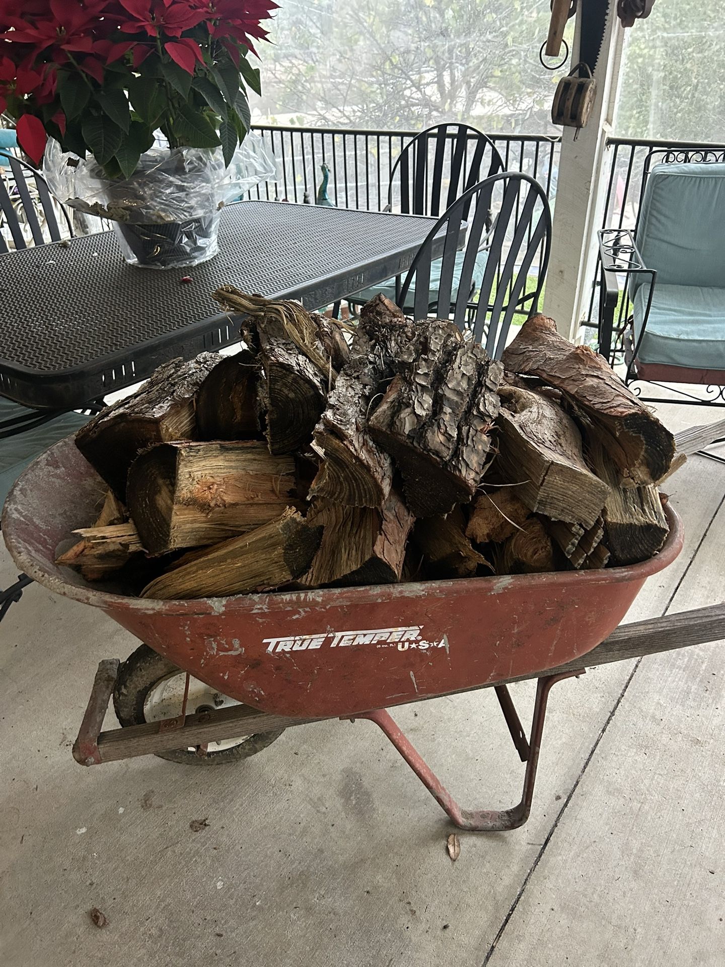 Firewood, dry and ready to burn. It has been split and in easy manageable pieces. A wheelbarrow load is $35 and a truckload is $300 (can deliver for a fee). It is a mix of pine, oak, and eucalyptus.