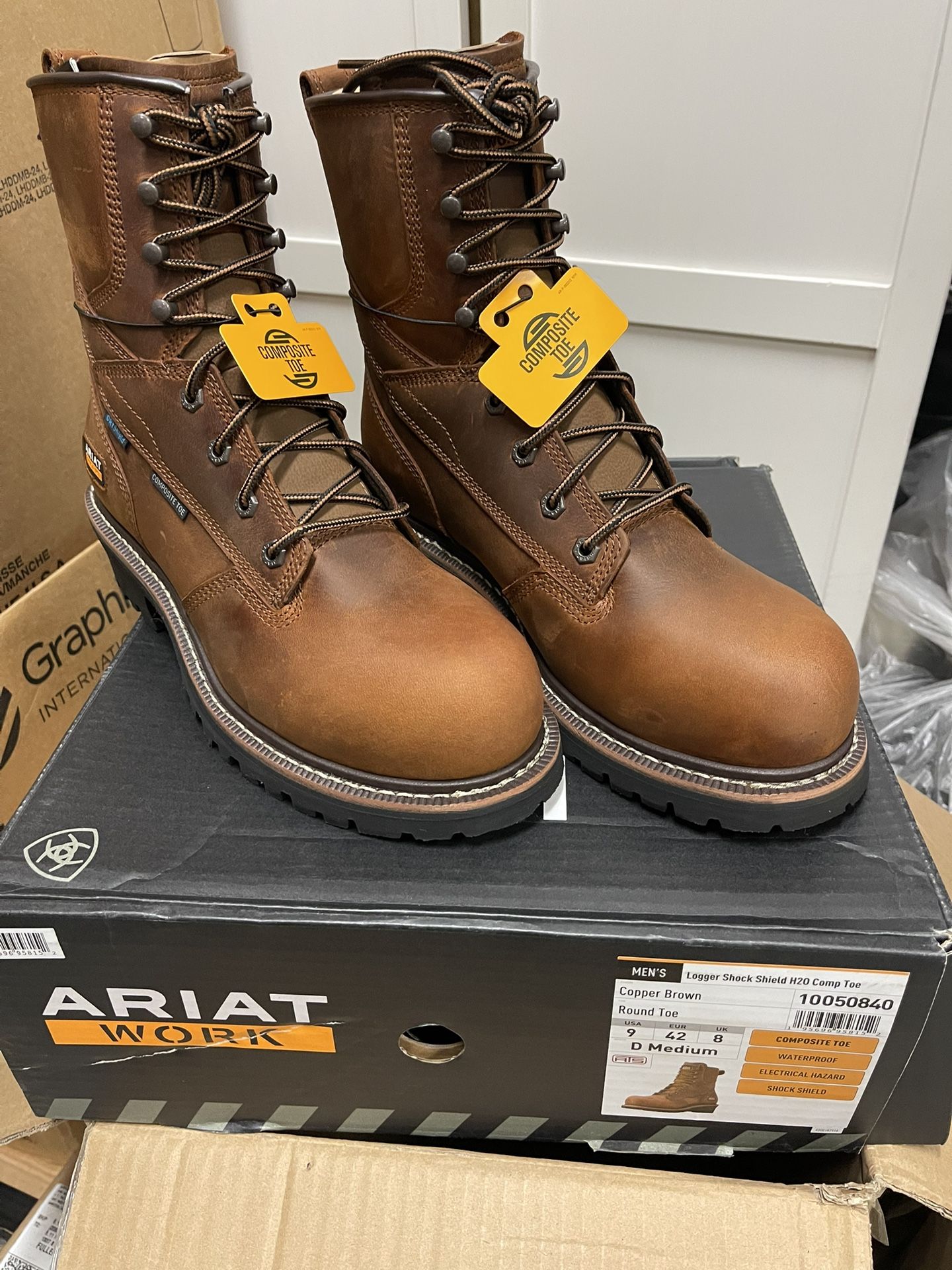 Men's Ariat Logger Shock Shield Waterproof Insulated Composite Toe Work Boot Rugged logger style meets Ariat innovation. The Logger Shock Shield absorbs impact to your feet, helping you stay comfortable, longer. Extremely durable, cushioned, and with heavy-duty traction, it's ideal for harsh outdoor jobs, high-heat environments, and intense construction work.