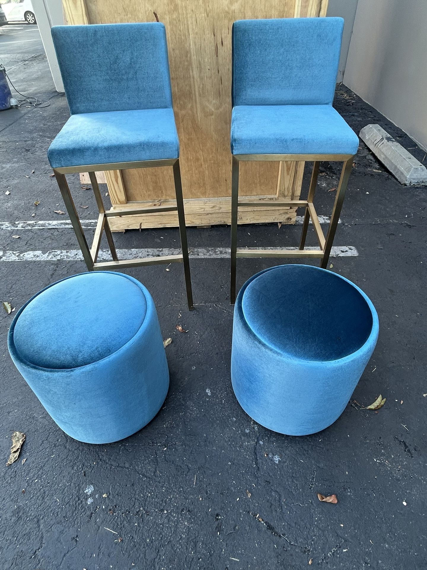 2 Tall Stools And 2 Small Stools Together Solid and sturdy Look at last pic, scuff on backside corner and little cut in the center of one if thw tall stools. Seat height 33” total height 44”