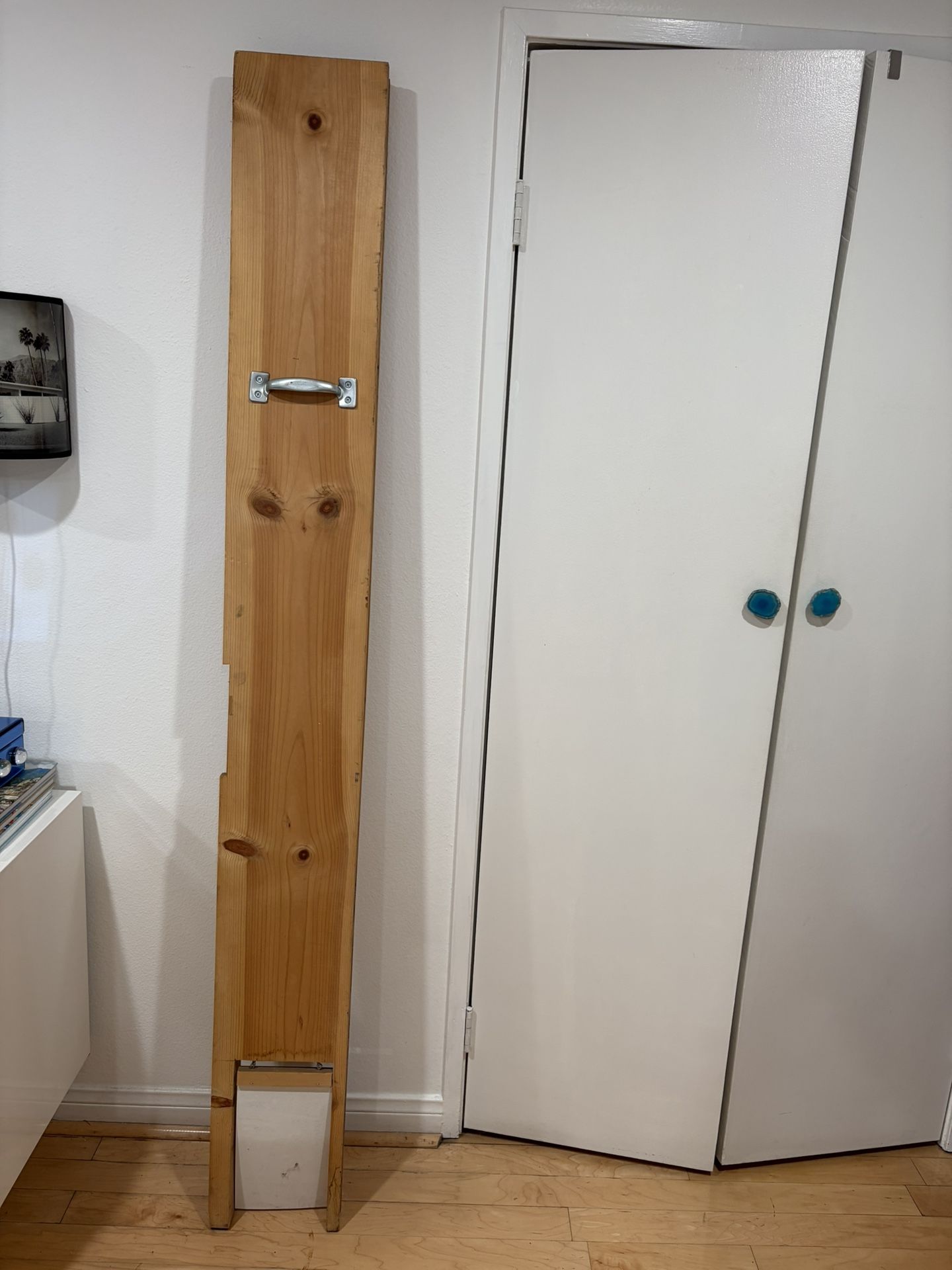 Solid wood, perfect for dogs and cats. It’s an extension of the door. The last picture is how it looks on, but it’s not white and metal, is wood. Great condition. Measures 78” tall and 9 1/4” wide. Custom made.