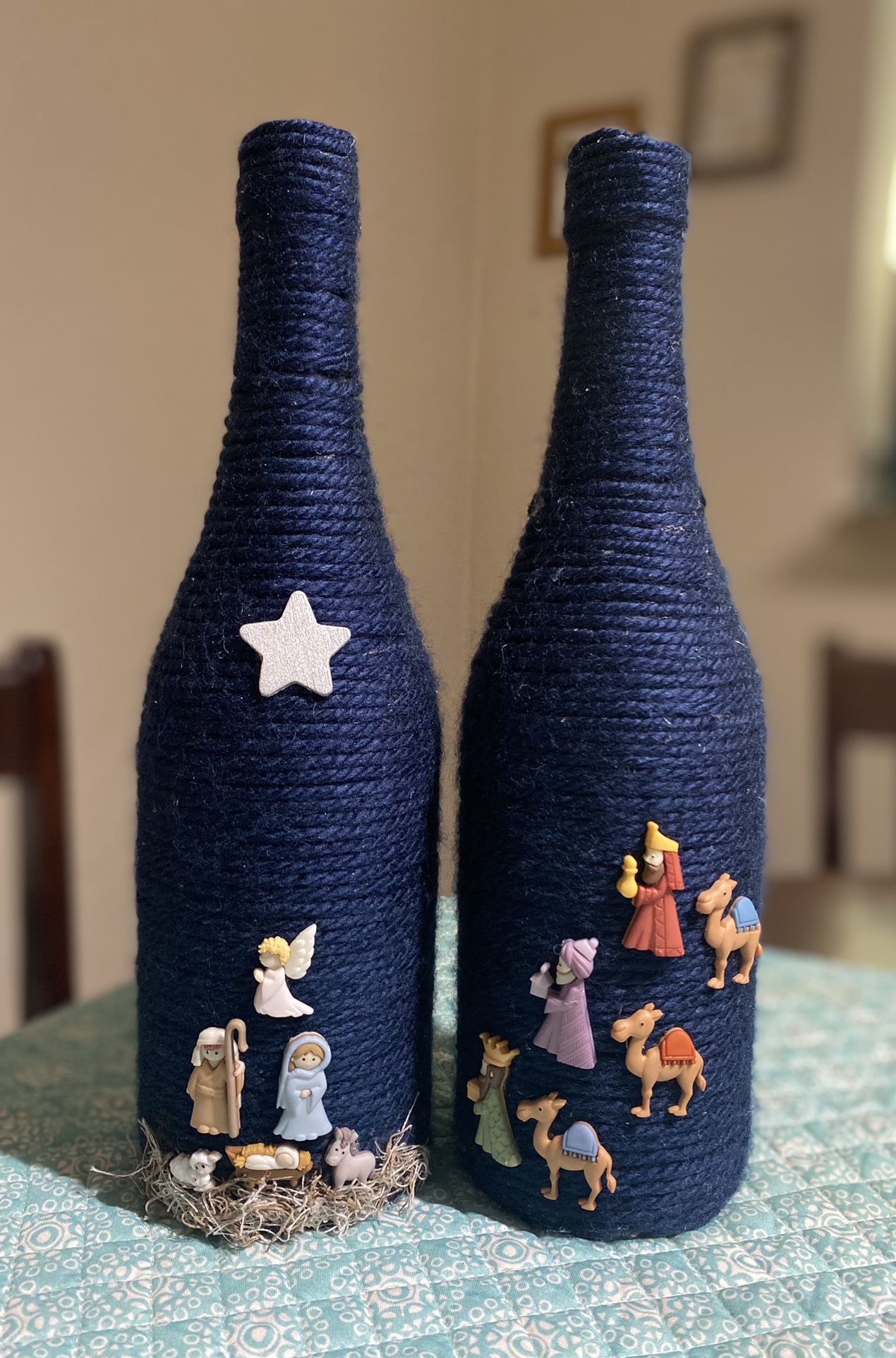 Nativity & Three Kings wine bottle set. Decorated in navy blue yarn.