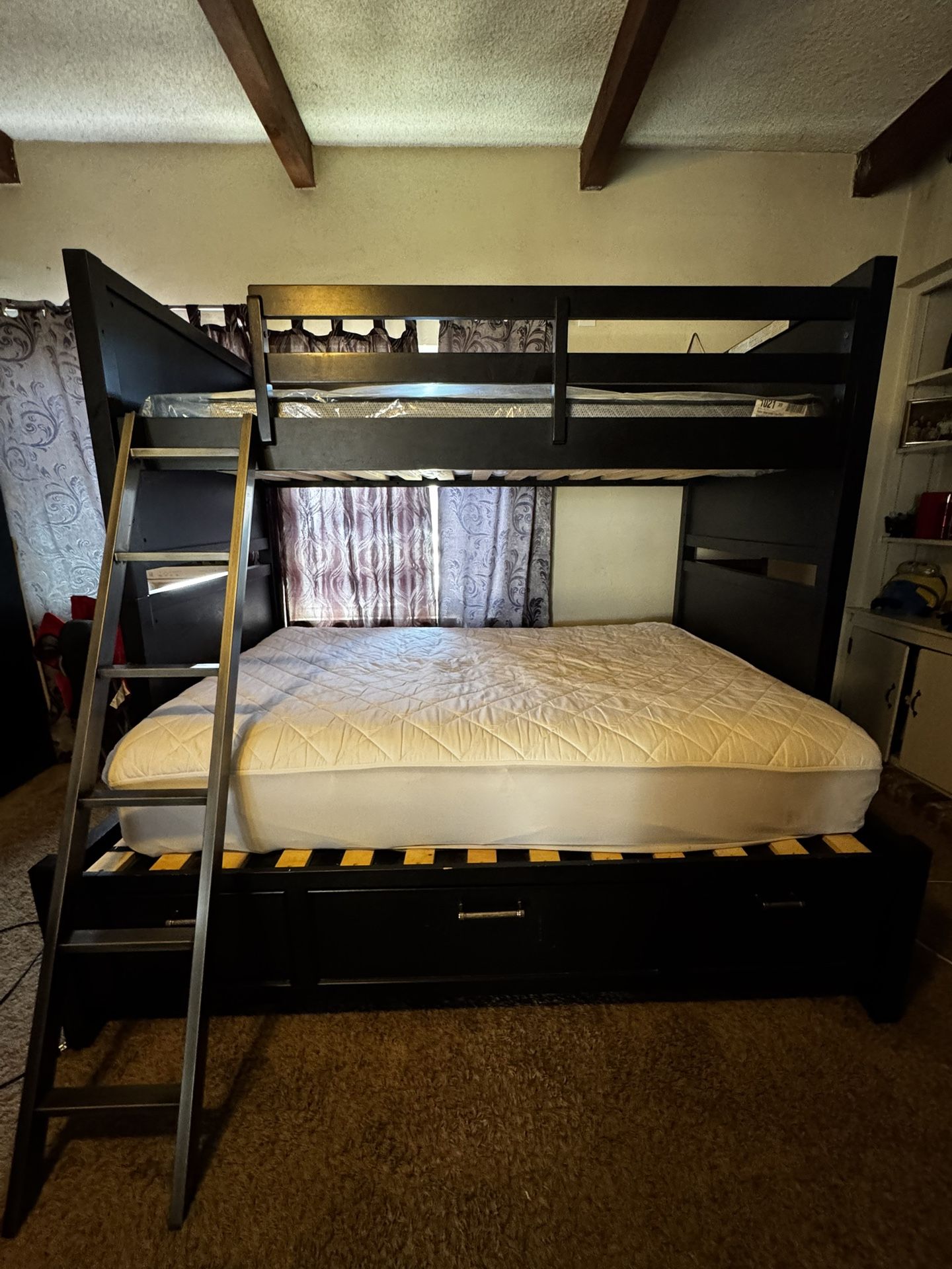 Taken apart with all screws ready for pick up! Wood/ metal black 2 bed- bunk bed ( top twin, bottom full) both mattress new w plastic covers attached. 3 sliding drawers with a metal ladder Bought 1.5 year ago top was never used. Serious buyers only- Located on the east side of Bakersfield.