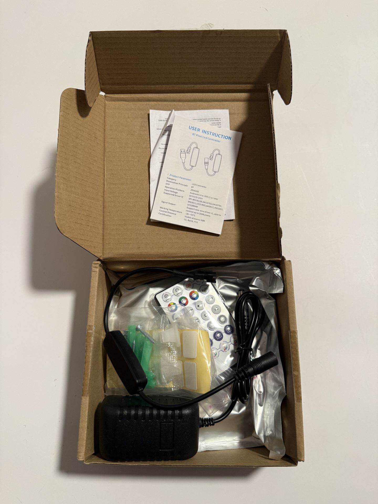 RGB LED light controller kit with remote control and power adapter. Perfect for customizing LED strip lighting for bedrooms, gaming setups, TVs, desks, shelves, or home décor. Use the remote to easily change colors, brightness, and lighting modes. Includes: • LED controller • Remote control • Power adapter • Mounting hardware • User instructions Features: • Multiple RGB color options • Remote control operation • Adjustable brightness and modes • Easy installation Condition: New, open box.