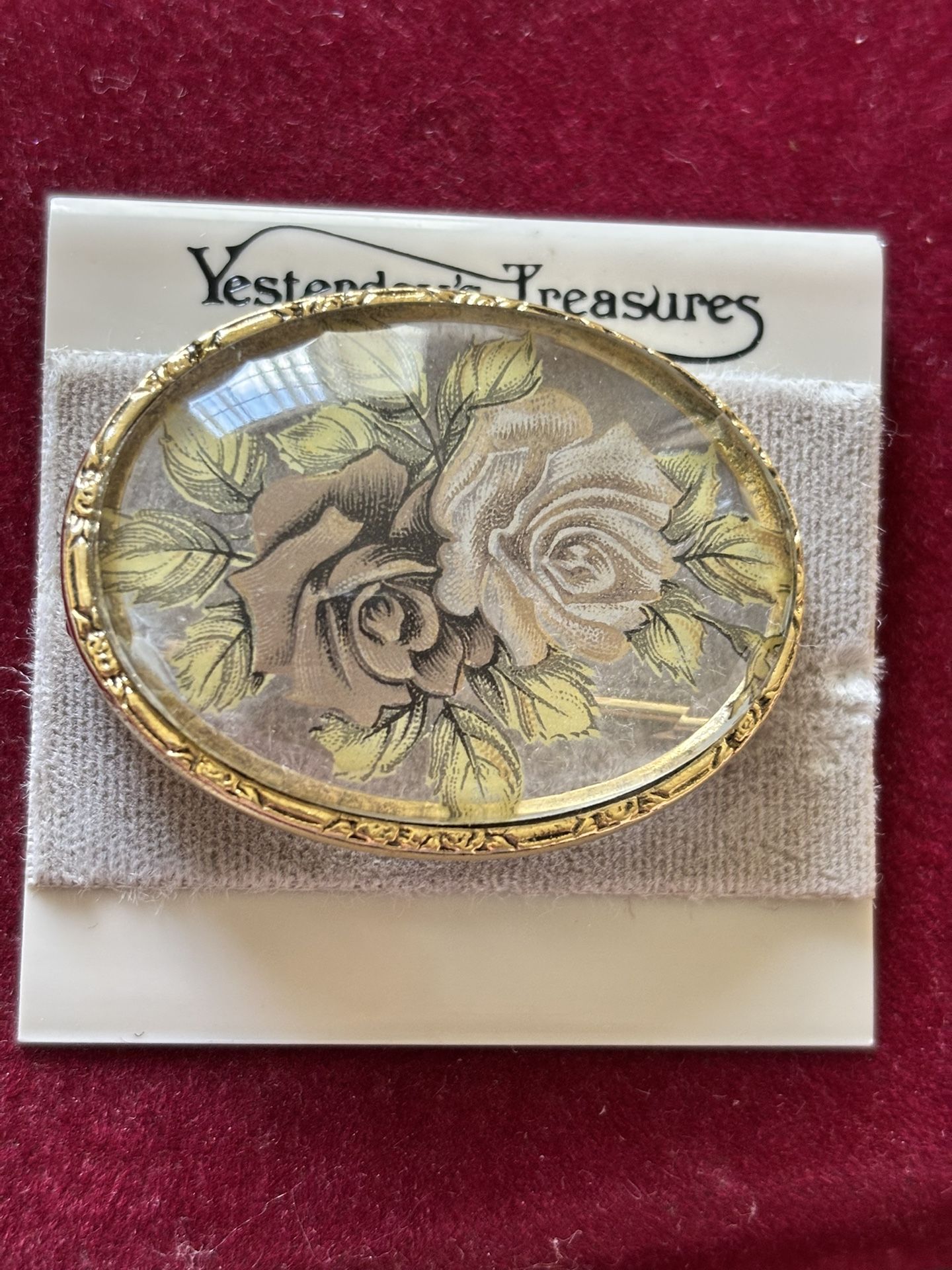 Vintage Large Oval Gold Tone Glass Floral Rose Bouquet Brooch