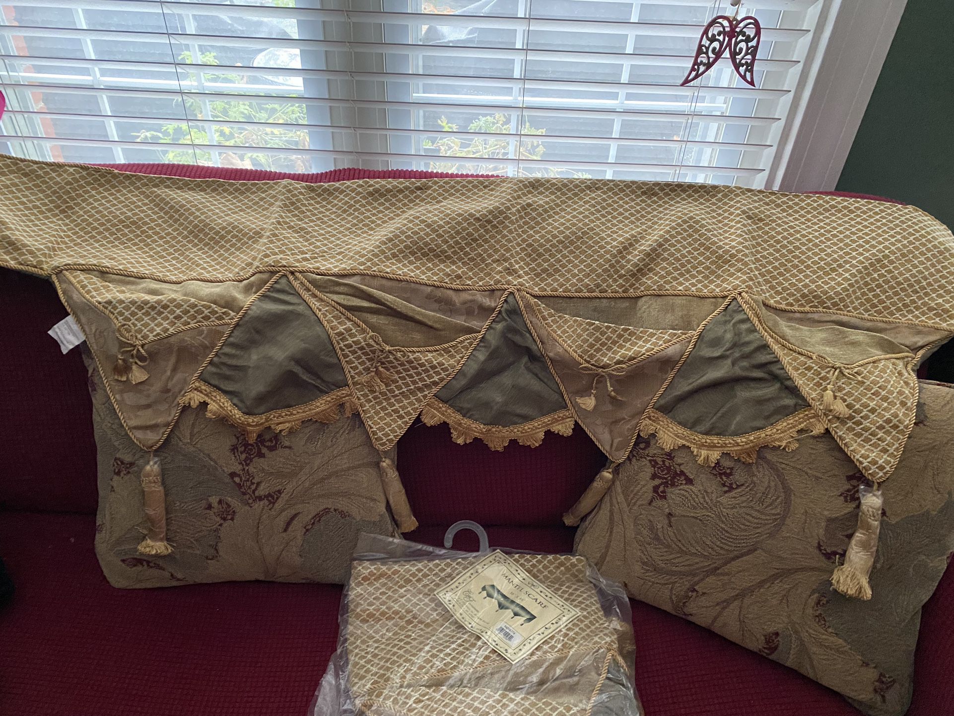 Gold and sage mantel scarves (2). Opened one, never used. Paid 80.00 each missed return window. or best offer! Pictures don’t do them justice. Could be used on a mantel or sideboard. Price for each