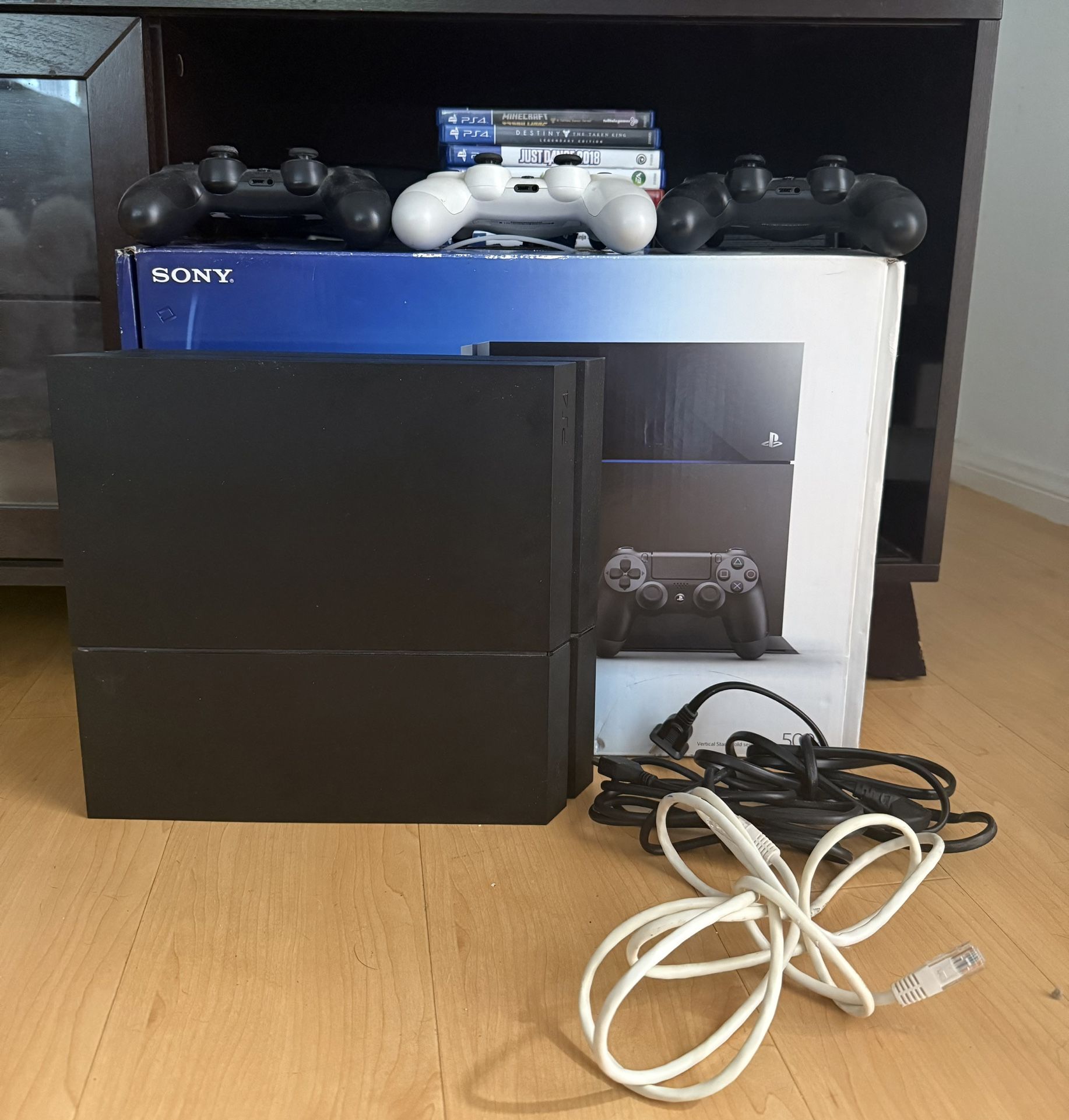 Used, but still in mint condition. Comes in the box, with three controllers, wires and nine games (Minecraft Story Mode, Destiny, Just Dance 2018, Sims4, Minecraft, Naruto Shippuden: Ultimate Ninja Storm 4 Road to Boruto, Naruto to Boruto: Shinobi Striker, Lego Batman 3 and Street Fighter V)