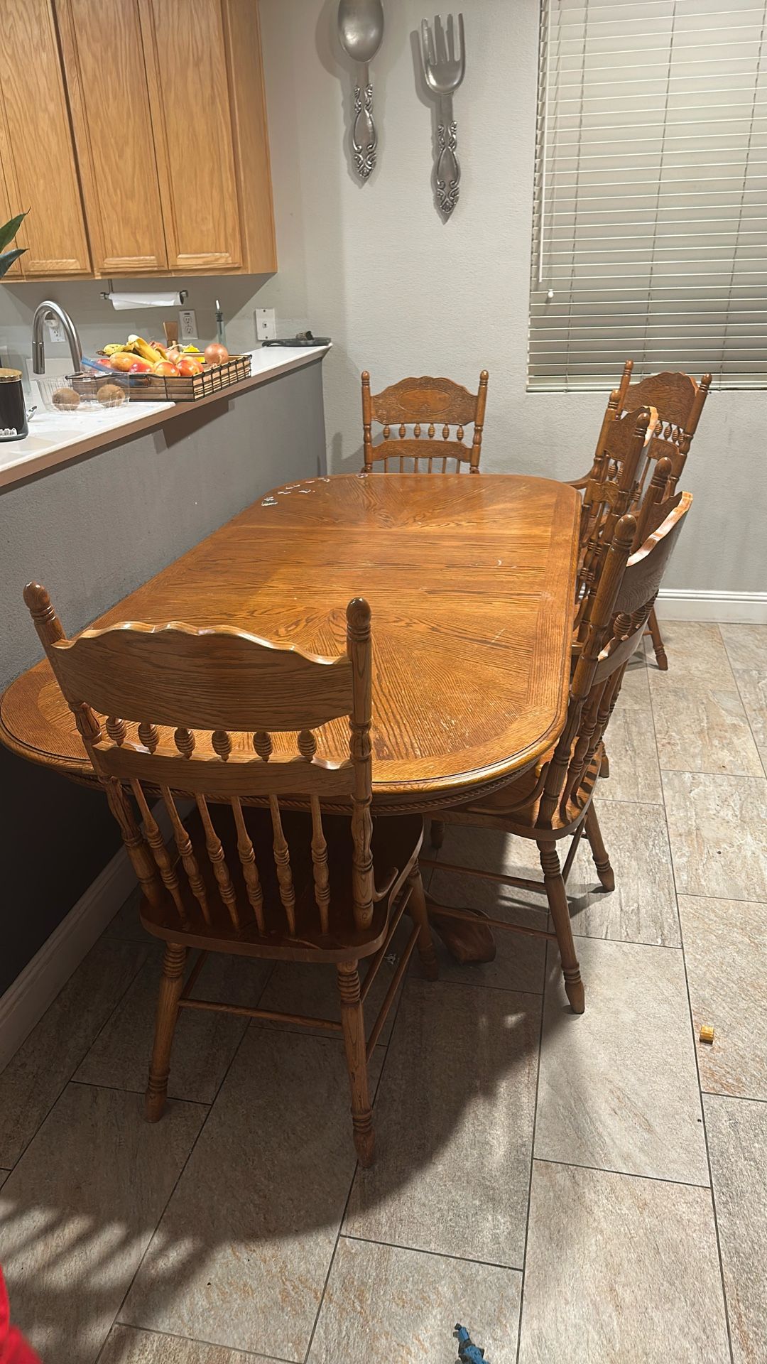 This table has been used. It does have wear and tear. It does have scratches. The table overall is very sturdy along with all the chairs, it has a middle section that can be taken off to be converted into smaller table. It has 6 chairs total. You pick up !!!!