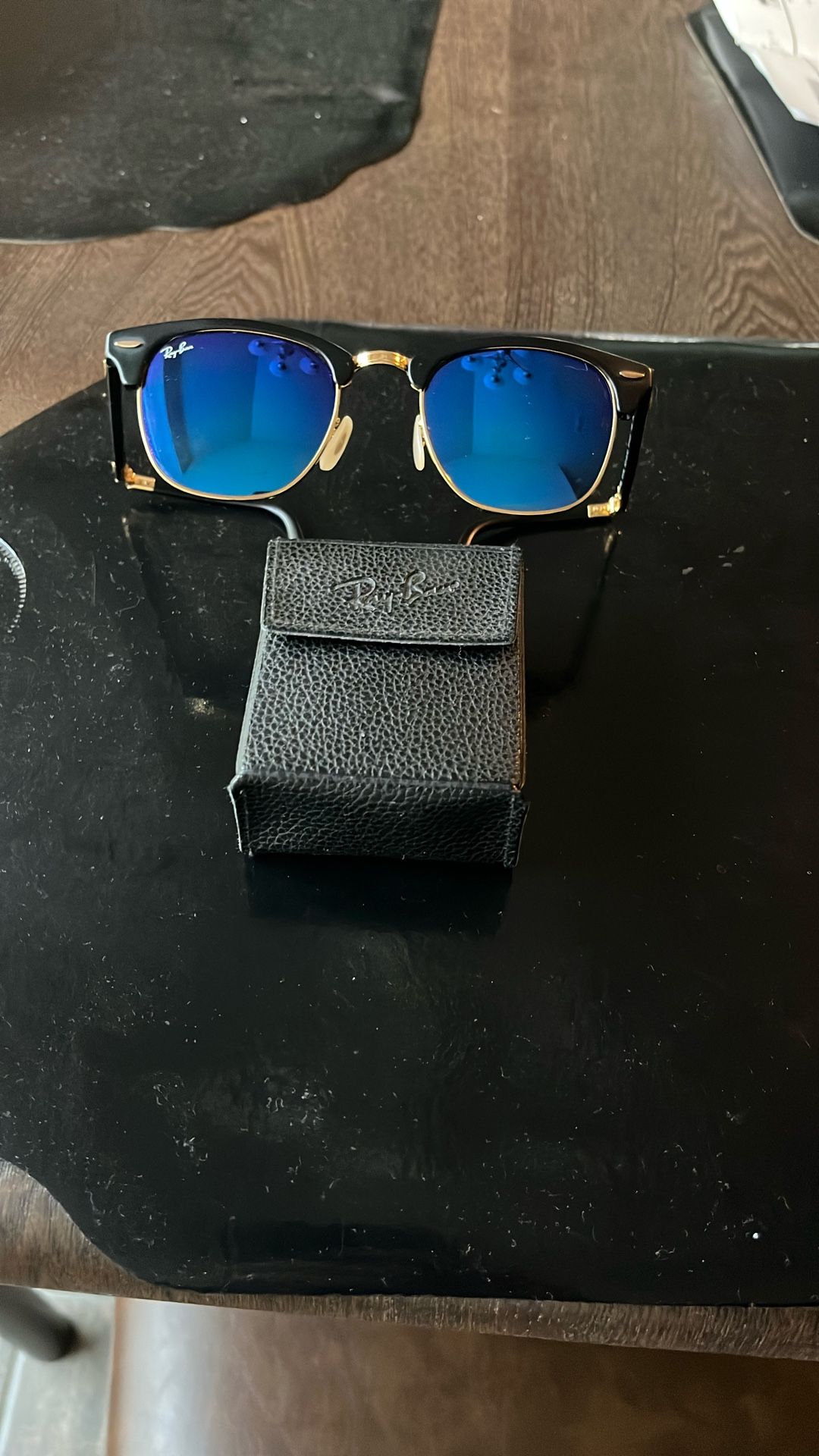 NOT A DOLLAR! Make offer,Ray-ban clubmaster sunglasses blue lens foldable sunglasses w/case for sale. They are size medium, glasses are in great shape, they are expensive new however make me a REASONABLE cash offer and they could be yours! MAKE OFFER!