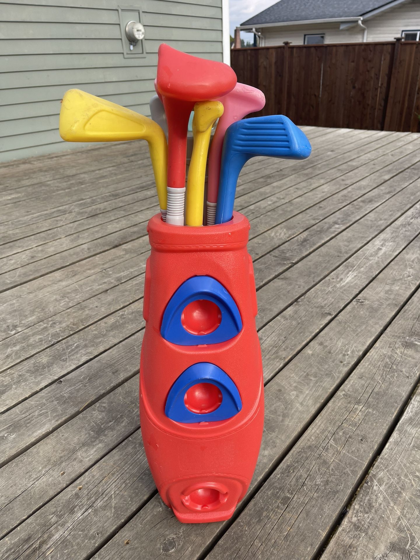 5 plastic golf clubs, plastic club caddy, 2 holes. The balls are missing/not included.