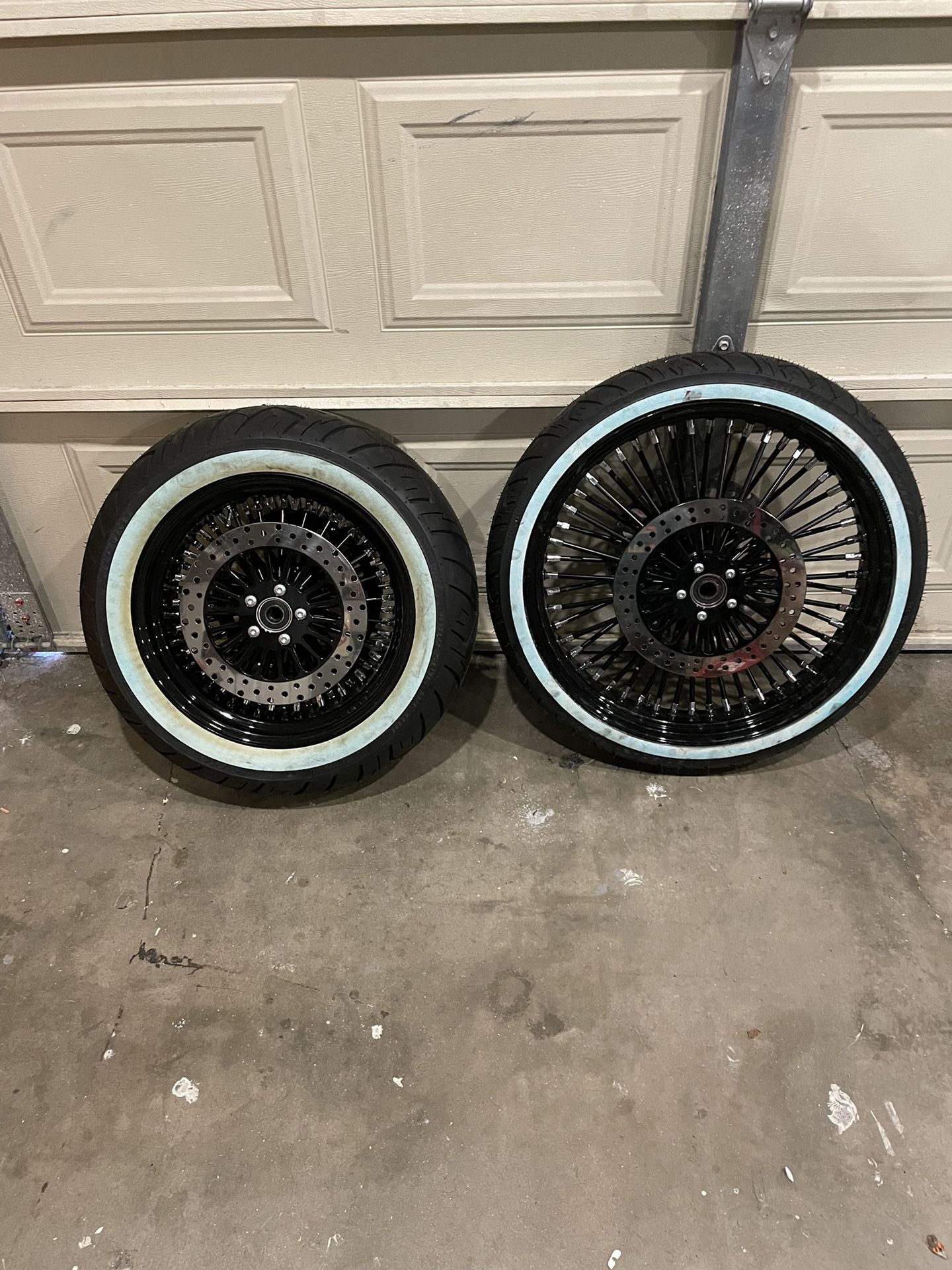 21” front and a 16” rear along with rotors front and back and pulley . They were suppose to go on my 2008 HD Dyna Fat Bob but decided to go a different direction.