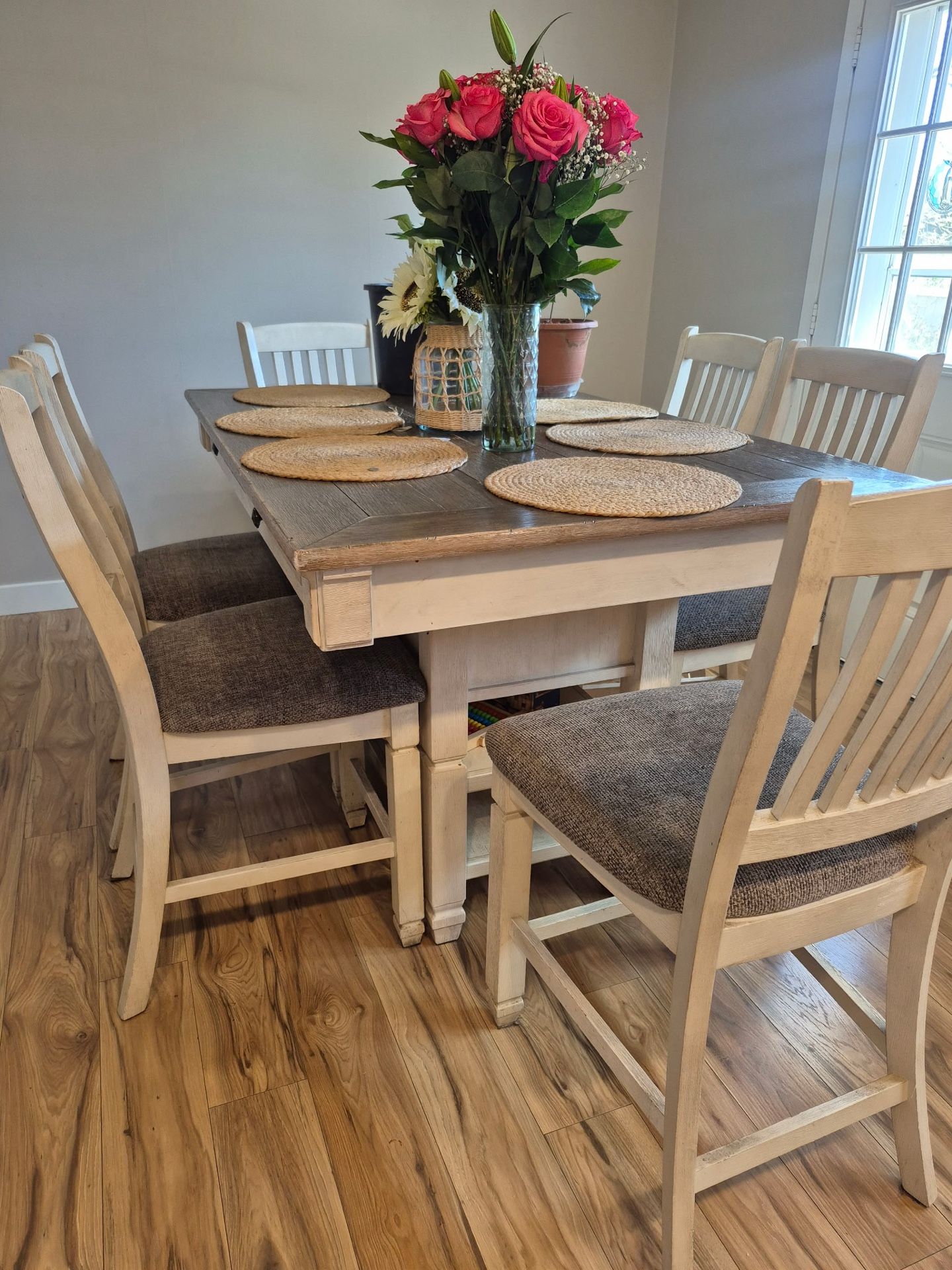 Wooden dining table with 6 seats. In decent condition. Chairs have slight scratches. $400 obo