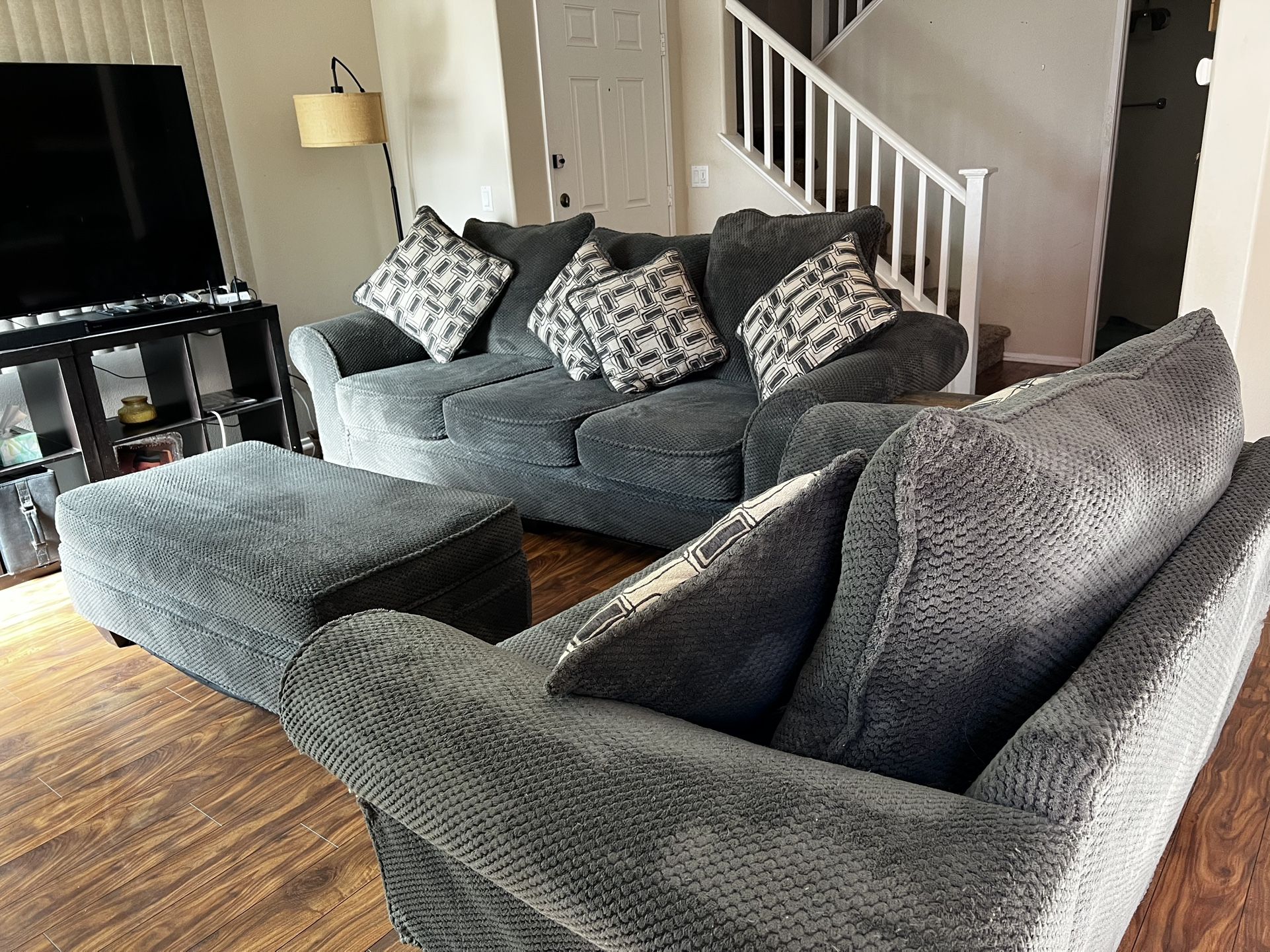 Grey-green Sofa, Chair, And Ottoman