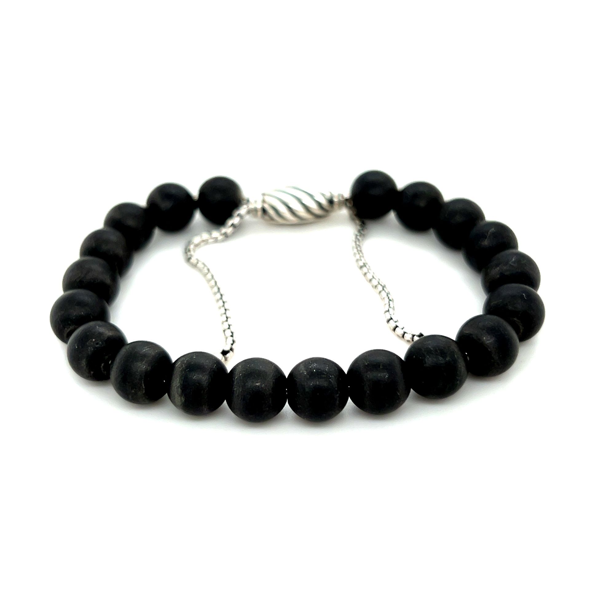 SPECIFICATIONS: Metal: Sterling Silver 925 Size: Adjustable Condition: Preowned Authentic David Yurman Onyx Spiritual Beads Bracelet. No original packaging. Note: Pictures are enlarged to show fine details of the product.
