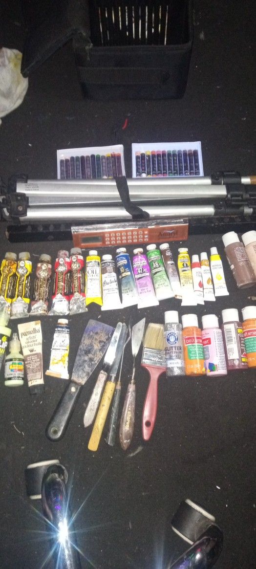 I have some really quality paints that have never been opened and the ones that are opened have been taken care of,glow in the dark paints,chalks and the tools are in perfect condition.the stand holds up to a 36 inch canvas...