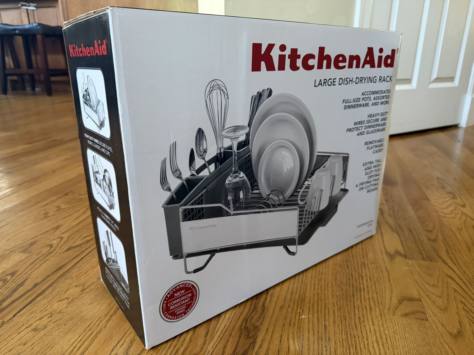 Brand new, unopened/sealed box. KitchenAid Large Capacity Full Size Rust Resistant Dish Rack with Angled Drain Board and Removable Flatware Caddy SPACIOUS DESIGN FOR LARGE LOADS: This full size dish rack offers ample space for plates, mugs, glasses, bowls, utensils, and even larger items like pots and pans. Please refer to product dimensions to ensure an ideal fit for your countertop. NON SLIP, STABLE BASE: Equipped with soft, anti slip feet, this dish rack stays securely in place, protecting surfaces and providing stability even on smooth countertops. RUST RESISTANT, DURABLE COATING: Constructed with heavy duty satin coated steel wires, this dish rack is designed to resist rusting and stand up to daily kitchen use. To maintain optimal rust resistance, dry the rack and drainboard after use. IMPROVED ANGLED DRAINAGE SYSTEM: The angled drainboard directs water straight into the sink, preventing pooling and keeping countertops dry. The board and rack are precisely aligned for smooth water flow and easy cleaning. REMOVABLE FLATWARE CADDY WITH ADJUSTABLE COMPARTMENTS: The flatware caddy features adjustable sections to keep utensils organized. Its built in handle makes it easy to remove and unload directly into drawers or cabinets. Material Carbon Steel, Plastic, Stainless Steel Product Dimensions 14.96"D x 20"W x 7"H