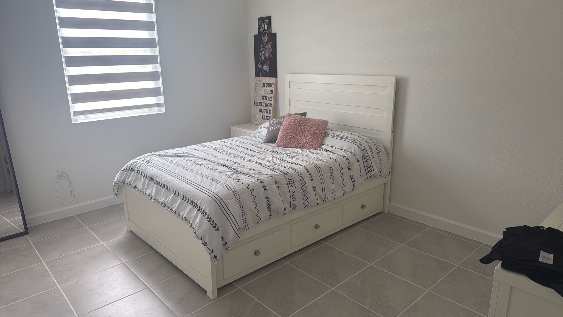 White Full Bedroom Set including mattress Juego de cuarto blanco tamaño Full, incluye colchón Includes: Bed/Cama Mattress/Colchon Night stand/Mesita de noche Dresser/Comoda