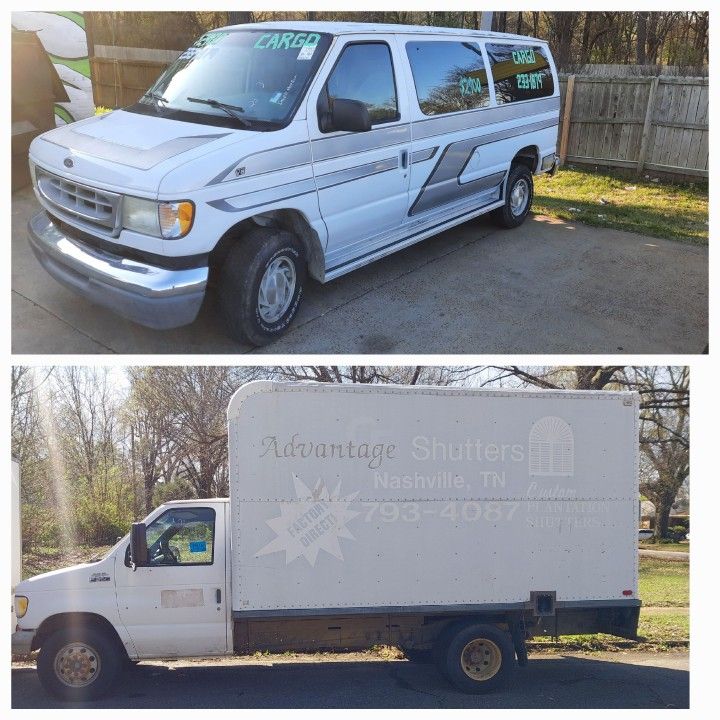 I have 2 work ready vehicles titles in hand. 1997 Ford E150 cargo van $2200 Ford F-350 box truck. $4,500 Van was previously passenger van that was handicap accessible. Rear seats removed It is now cargo ready. No issues. Cranks on a dime and moves good. Box truck is also ready for work, no issues. Engine runs smoothly moves good also. Will make PACKAGE DEAL if interested