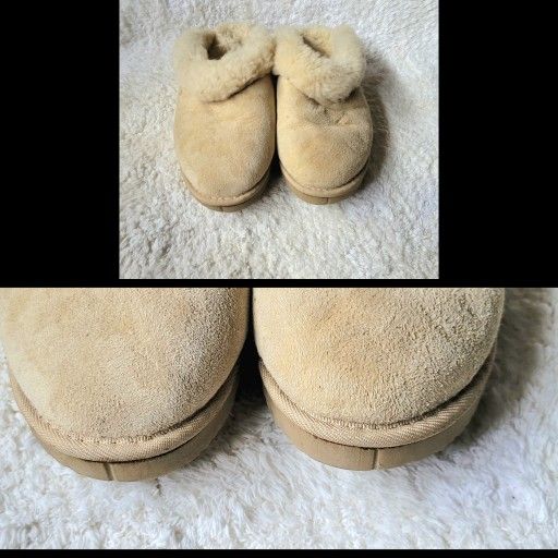 $17 UGG Slippers Clugette Beige Suede Sheepskin Fur Lined Style: 5355 Please see the close-up pictures I took to get a good idea of the item's condition. Size: W6 Style: 5355 No Stain No Rip No Holes See prices from other sellers from other websites, eBay, Poshmark, OfferUp, etc.. The same item. The same condition. They are all selling for around $25-$100. Feel free to compare. Mine is ONLY $17! This is a GREAT DEAL!π
