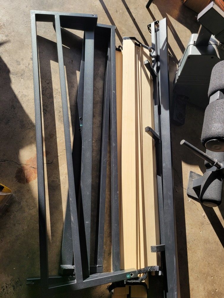 Twin bed frame Bought for my son but ended up being too small. Metal frame & wooden slats that hold up the mattress. I also have a mattress I can add in. No pix of the bed put together since we never did