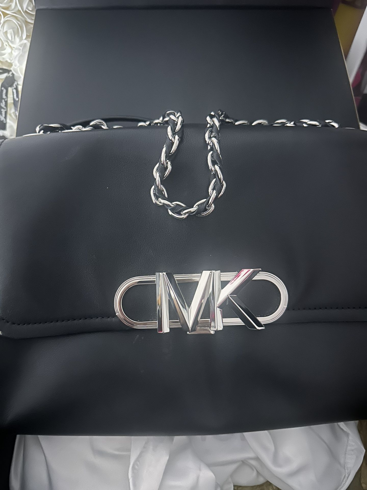 Black leather purse Silver accents Silver chain Comes with bag and box Free leather cleaner included Has a small makeup stain