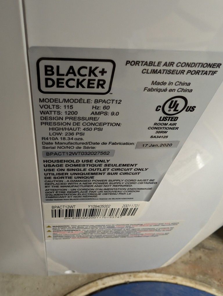 BLACK+DECKER 12,000 BTU Portable Air Conditioner up to 550 Sq.Ft. with Remote Used one season, new 399.99 Open to trades, no delivery
