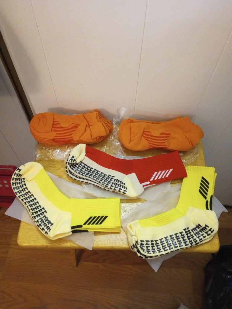 3 new unisex socks (2 yellow and 1 red) and 10 orange socks. 3 Nuevas calcetas unisex ( 2 amarillas y 1 roja ) y 10 calcetines color naranja.
