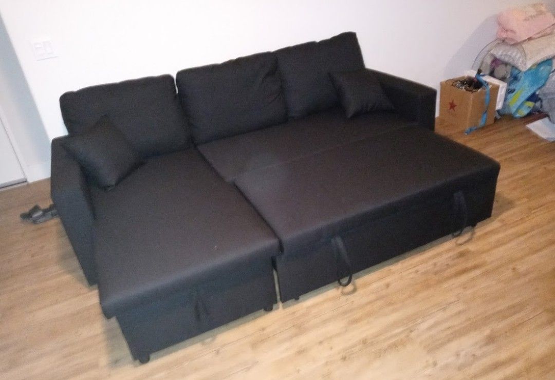 Black Linen Pull Out Sectional Sofa w/storage chaise