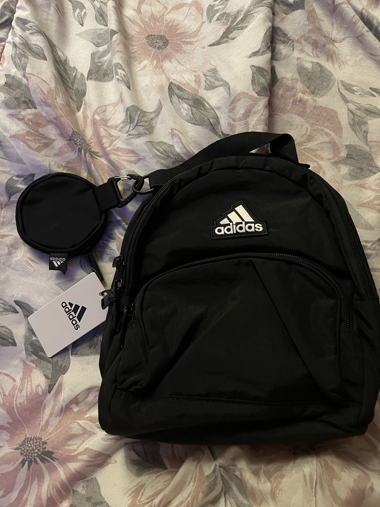 Adidas Mini backpack with a little pouch to hold stuff like change $ or even cards. Adidas mini backpacks are so popular because of the type of style, practicality, and durability. Because they hold more then you expect which allows them to be easily carried and used for various purposes like daily errands or travel, or even a nice little look too but also while still offering enough space for essentials. and lastly the lightweight of the backpack. Can always negotiate price ✅